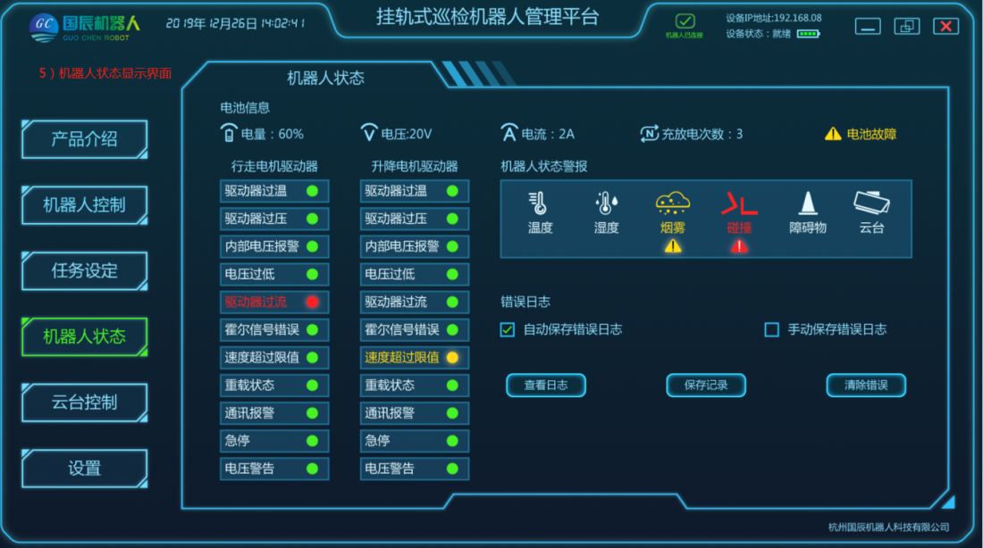 項(xiàng)目主要由移動(dòng)機(jī)器人本體、軌道系統(tǒng)、采集設(shè)備、定位系統(tǒng)、供電和通信系統(tǒng)、后臺(tái)系統(tǒng)等結(jié)構(gòu)組成。在巡檢工作過程中,由用戶設(shè)定任務(wù)點(diǎn),加裝采集設(shè)備,移動(dòng)機(jī)器人根據(jù)控制指令在軌道上運(yùn)動(dòng),將采集設(shè)備運(yùn)送到指定位置采集數(shù)據(jù),且滿足所需要的負(fù)載量,速度;在機(jī)器人行駛過程中可實(shí)現(xiàn)自主爬坡、采集設(shè)備可根據(jù)監(jiān)測(cè)物體高度進(jìn)行升降調(diào)整等功能;配套的調(diào)試軟件支持手動(dòng)、控制移動(dòng)平臺(tái)運(yùn)動(dòng);具有較強(qiáng)的適用性及拓展性,可自定義模塊搭配,自主設(shè)定任務(wù)點(diǎn),自動(dòng)巡檢、定點(diǎn)采集、自動(dòng)充電等功能。